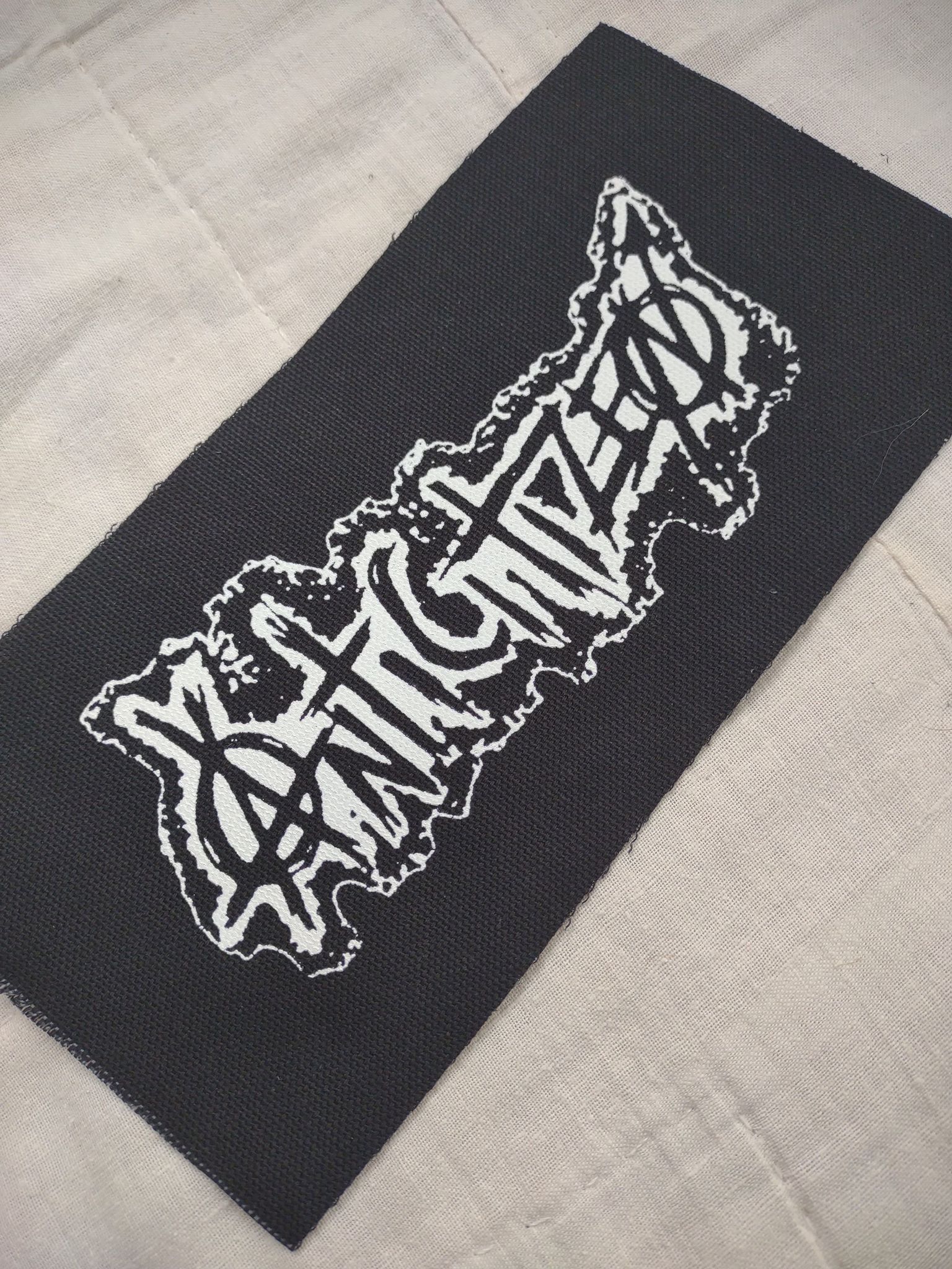 Large high quality screen printed patch, white ink on black canvas, approx. 4" x 6"