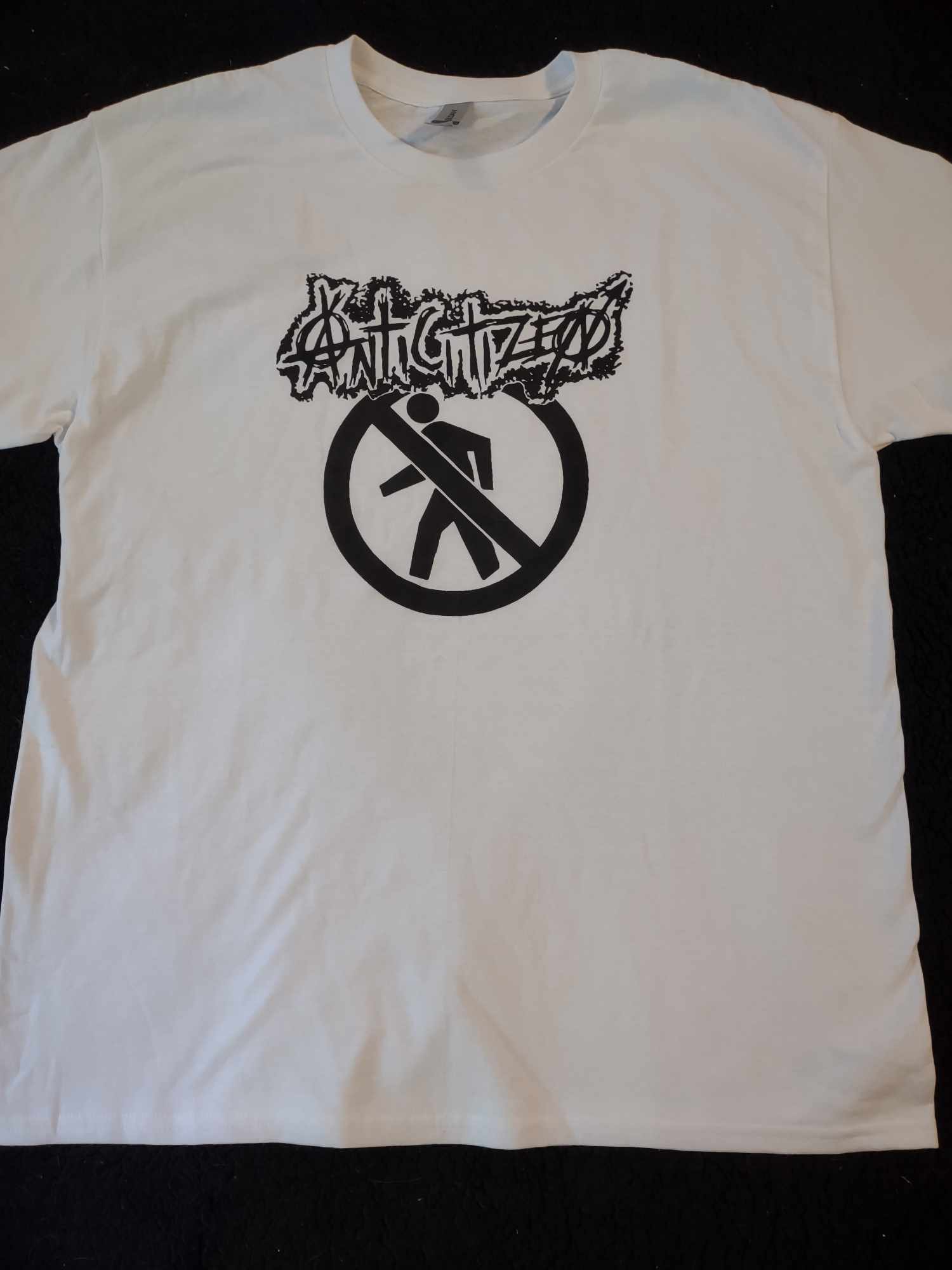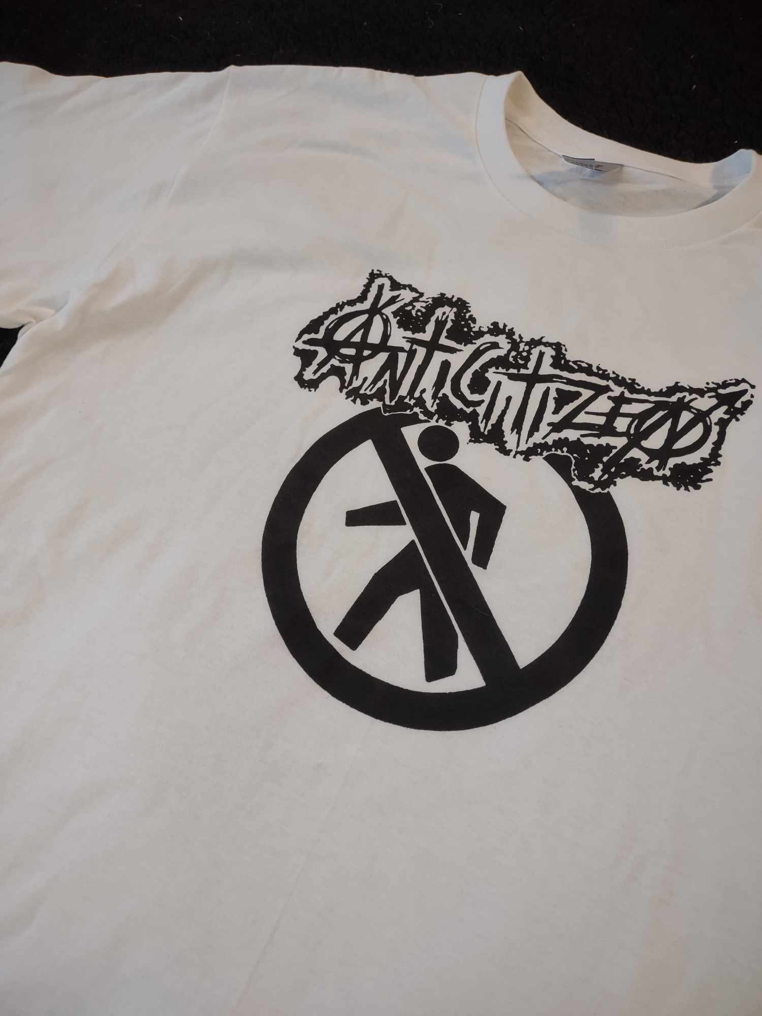 White shirt with black print of the Anticitizen logo and Crossman symbol. Available is Small, Medium, Large and XL.