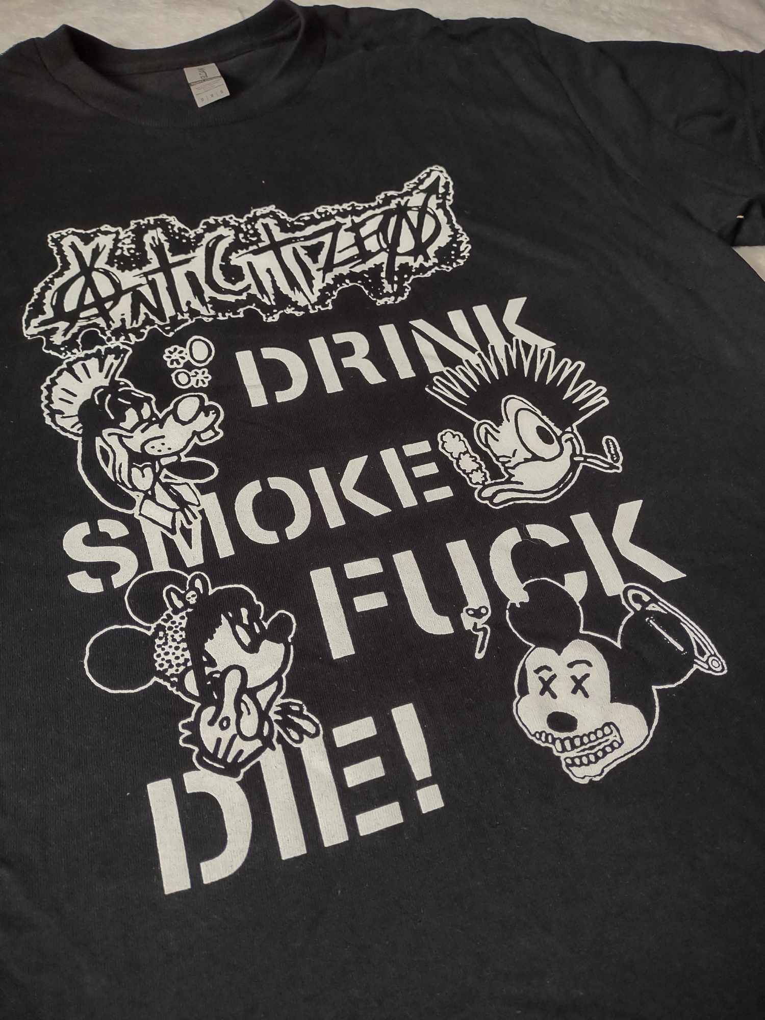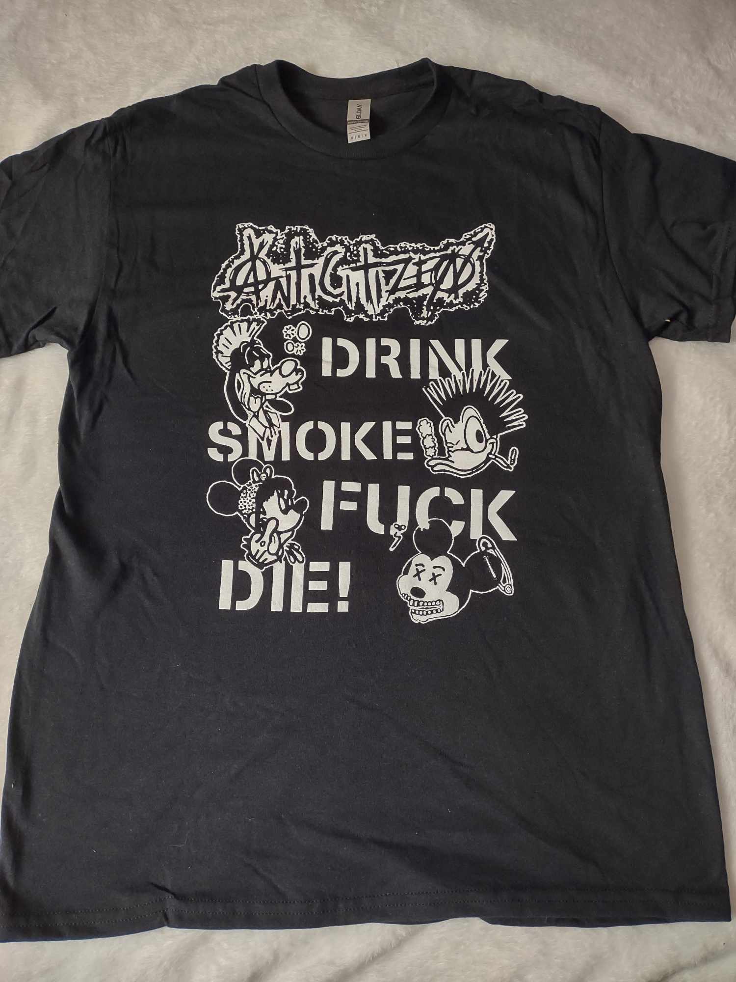 A black shirt with the Anticitizen logo and DRINK SMOKE F*CK DIE print in white. Available is Small, Medium, Large and XL.